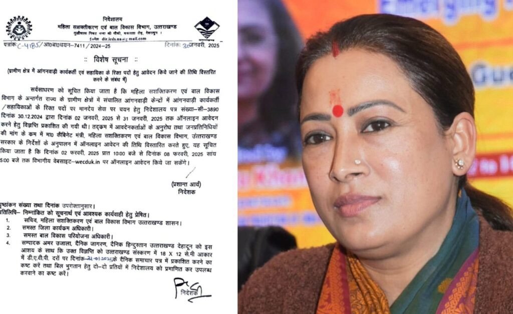 कैबिनेट मंत्री रेखा आर्य ने बताया कि प्रदेश के सभी जनपदों में मिनी आंगनबाड़ी केंद्रो का उच्चीकरण किया गया था, जिसके बाद वहां नये पद बन गये थे। कैबिनेट में आंगनबाड़ी भर्ती नियमावली में संशोधन किया गया था, जिससे इन पदों पर भर्ती का रास्ता साफ हुआ। इन पदों के लिए ऑनलाइन आवेदन 2 जनवरी को शुरू हुए थे और आवेदन की अंतिम तिथि 31 जनवरी तय की गई थी। इस दौरान नगर निकाय चुनाव में सरकारी मशीनरी व्यस्त होने के चलते बहुत सारी आवेदन करने की इच्छुक महिलाएं अपने प्रमाण पत्र आदि नहीं बनवा पायी। कैबिनेट मंत्री रेखा आर्या ने बताया कि प्रदेश के सभी जनपदों से आवेदको और जनप्रतिनिधियों द्वारा आवेदन का समय बढ़ाने के लिए निवेदन किया जा रहा था। आवेदकों की सुविधा को देखते हुए आवेदन का समय 08 फरवरी, शाम 05:00 बजे तक कर दिया गया है।