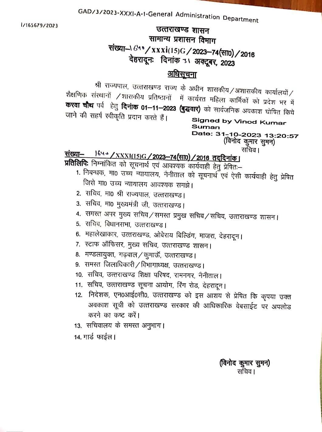 उत्तराखंड सरकार का महिला कर्मचारियों को तोहफा, एक नवंबर को छुट्टी घोषित